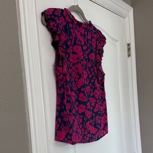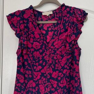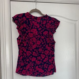Elevate your wardrobe with this chic floral blouse. Featuring vibrant pink patterns and elegant ruffled sleeves, it's perfect for any occasion.