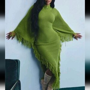 Stylish Fringe Trim Batwing Sweater Dress For Women - Long Sleeve, High Neck