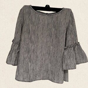 Design: Elegant gray and white stripes with charming ruffles on the sleeves