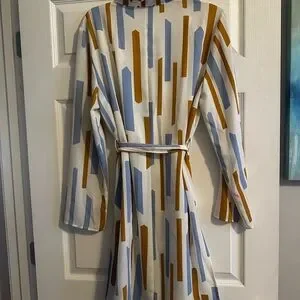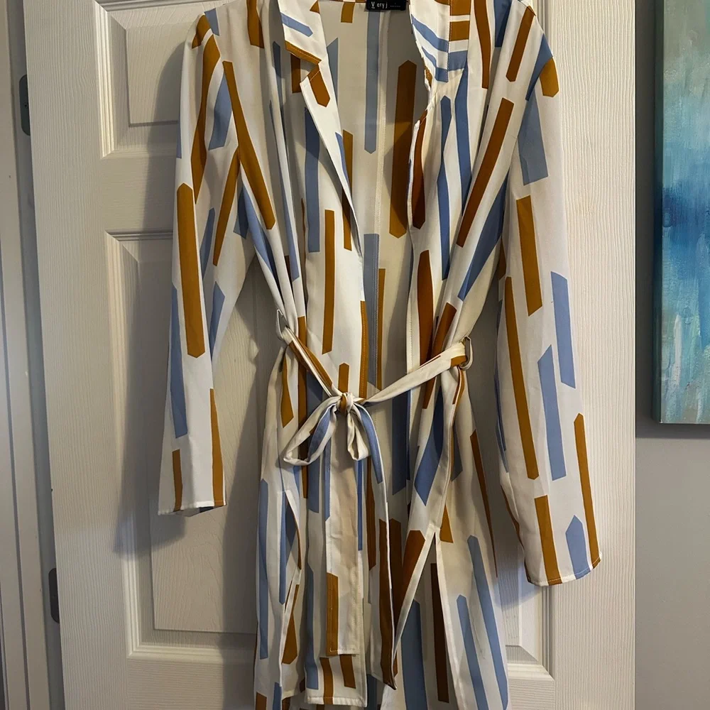 Elegant top with geometric design. Features blue and brown accents. Perfect for stylish outings. Has a flaw near the pocket I took a photo close up worn twice. Super cute