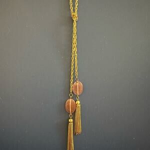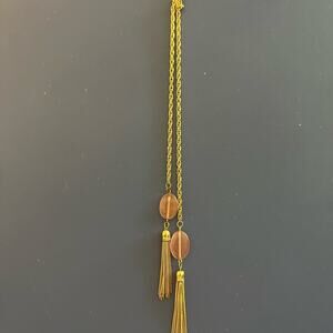 Stylish Gold Tone Lariat Necklace with Tassels & Pink Quartz