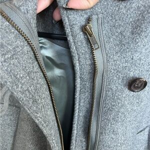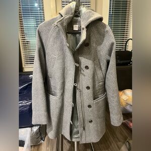Elegant gray coat with a hood. Features button and zipper closure. Wool coat that’s lined. Beautiful heather grey. Interior of hood has some rust stain is only flaw to an otherwise mint condition coat that was only worn a few times during one trip.