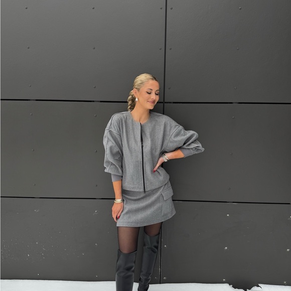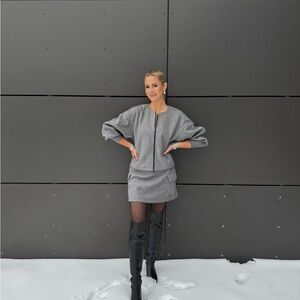 Chic gray two-piece set featuring a long-sleeve top and matching skirt. Perfect for a modern look. Worn only once