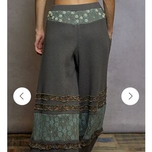 Unique gray pants. Raised pearl flower clusters on pants. Lace insets in sage green. These pants are stunning.