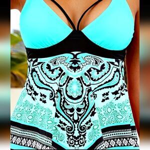 Stylish Hot Print Tankini Swimsuit Blue/Aqua And Black Size L NWT
