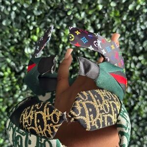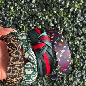 Set of four chic headbands. Features black and gold, green and white, green with red stripe, and multicolor patterns. Perfect for adding a touch of elegance to any outfit.
