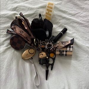 Chic keychain set with various accessories. Features a mix of black and brown tones.