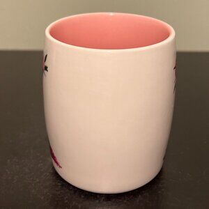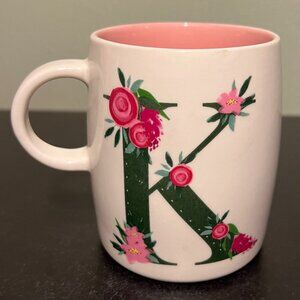 Sip your favorite drinks in personalized style in this stylish off-white ceramic mug with an elegant floral arrangement shaped like a letter K to represent your first or last name. Both sides feature a large, dark green, capital letter K adorned with pink and violet flowers. Beautiful pink interior. Chic and comfortable C-shaped handle. Dishwasher safe. Measures 4” tall with a 3” diameter. Holds 14.5 fluid oz.
