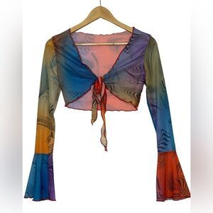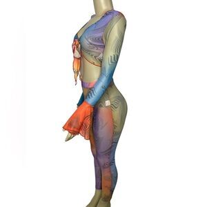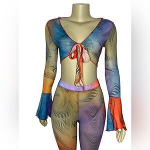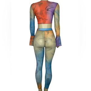 Colorful Swirl Design Pants & Crop Top Set - Women’s Fashion - Size: Small, Medium, Large- Straight Fit Pants - Long Sleeve V Neck Crop Top - Elastic Waist - Lightweight & Stretchy - True to Size - Sexy & Cute - Multicolored Stylish Ensemble