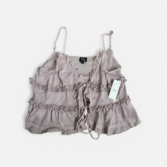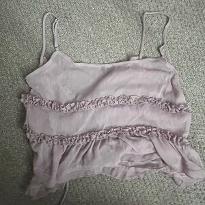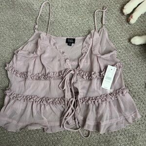 Chic tank top with elegant ruffles, perfect for any occasion. Features a soft mauve color and adjustable straps for a comfortable fit.