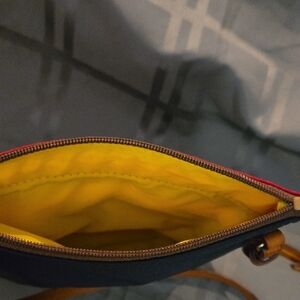 Elevate your style with this chic Dooney & Bourke crossbody bag featuring a blend of red, cream, and blue exterior. The interior is a happy yellow that makes it easy to find your items. Perfect for everyday use or travel.