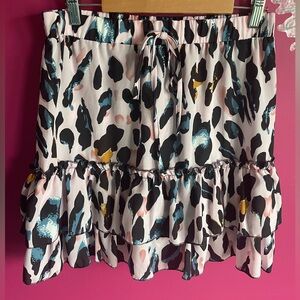 Elevate your wardrobe with this chic multicolor ruffle skirt. Perfect for any occasion, it features a playful design with a comfortable fit. 13” across elastic waist top (has drawstring) - 17” length measurement at side- cotton/polyester material
