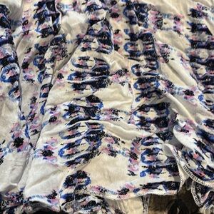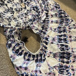Bohemian Surf Gypsy Off-the-Shoulder Top with Tassels. This playful top from Surf Gypsy features a relaxed, off-the-shoulder silhouette with a gathered, elasticized neckline. The white fabric is adorned with a subtle tie-dye or abstract pattern in shades of blue and purple. The hem is embellished with a fun row of black tassels, adding a bohemian and free-spirited touch. Perfect for beach days, festivals, or a relaxed summer look!