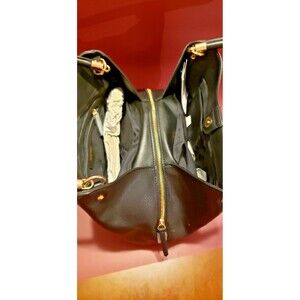 The Nine West Etta Jet Set Carryall Purse in black is a stylish and versatile shoulder bag perfect for everyday use. With a solid black exterior and gold-plated hardware accents, this medium-sized purse features double black handles and a convenient zip and magnetic closure. The interior is lined with black and includes inner pockets and dividers for organization. The sleek design and classic theme make this purse a fashionable choice for any outfit, while the faux leather handles add a touch of luxury. This designer bag from Nine West is both practical and chic, making it a must-have accessory for any fashion-forward woman.