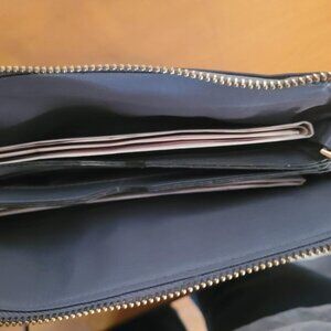 -Design: Compact rectangular shape with gold-tone zipper hardware