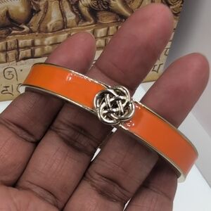 Elevate your jewelry collection with this refined and aesthetically pleasing bangle bracelet from the popular brand Stella & Dot. The vibrant orange enamel is beautifully contrasted by the classic touch of gold-toned metal, creating a truly eye-catching piece.