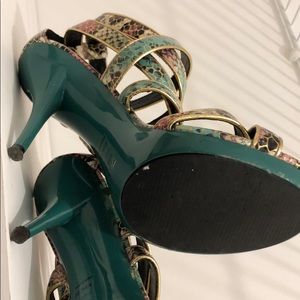 Beautiful python inspired show with gold accents. Cross-over strappy style sandal with so many options to coordinate with many colors (teal, salmon, cream, pink, black, grey). Nearly no heel or sole wear. Buy with confidence from my Smoke free, CoVid free shop/home. Quick shipping!