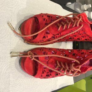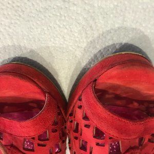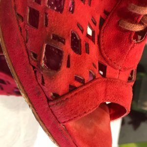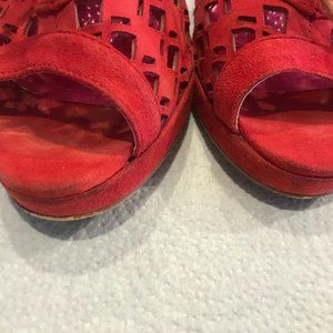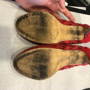These are gorgeous, well designed red pumps by Taryn Rose MD. Size 7.5 M. The material is suede. These shoes have been worn and they have multiple scuff marks as shown in the picture. This is why they are discounted and a steal at this price. These shoes are dirty but they still maintain their vibrant red color.