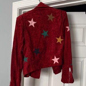 Elevate your style with this chic red jacket featuring colorful star patterns. Perfect for adding a pop of color to any outfit.