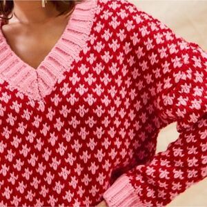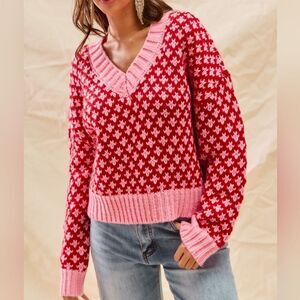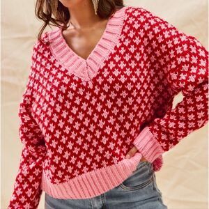 Houndstooth sweater Pink and red houndstooth sweater Two-tone houndstooth knit  Geometric pattern V-neck Cropped Oversized v-neck Balloon sleeve Knit Ribbed v-neck Casual sweater and jeans outfit Winter or fall sweater look