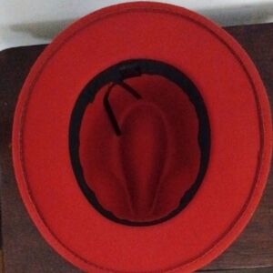 Elegant rust colored fedora hat. Polyester-cotton. Perfect for any occasion. Unisex. No hat ban included. In good, gently-used condition.