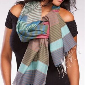 This Striped Scarf is hand-woven with 60% silk and 40% cotton in a stunning striped weave. This design features a cheerful color combination of colors... Blue & Green Lightweight but also generous in size, it can be worn around the neck or over the shoulders.