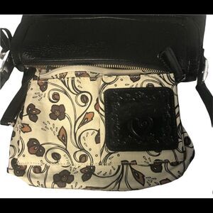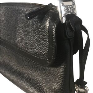 This compact shoulder bag is NWOT, adorned with classic signature Brighton silver fittings. The small pebbled black leather handbag is 11”W x 7”H x 2.5”D, with a 10” drop from shoulder strap, finished with shiny black patent leather trim. Both sides of the bag have outside pockets, both equipped with magnetic closures. The main large interior pocket features one large interior zip closure pocket and 2 smaller slip pockets, also contained with a zip closure. The purse features the Brighton signature silver hardware, on either side of the purse strap and the front closure, as well as the silver Brighton heart tethered to the hinge. Wonderful quality, Brighton floral print interior, great size…a good buy all the way around.