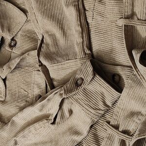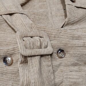 Upgrade your wardrobe with this stylish tan corduroy utility jacket. Featuring a belted waist and practical pockets, it's a versatile choice for any outing.