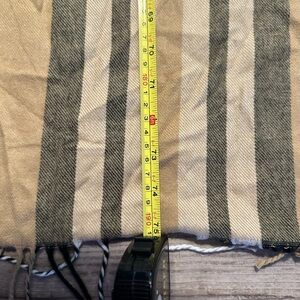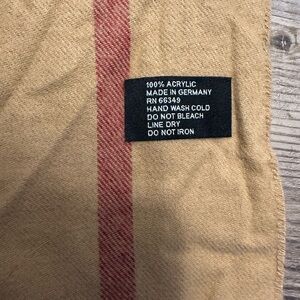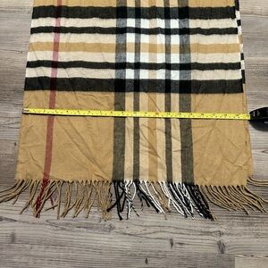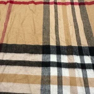 Elegant tan scarf with a classic plaid pattern. Features red, black, and white stripes. Perfect for any outfit.