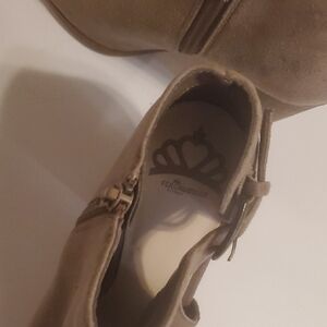 Stylish Tan Suede Like Ankle Booties Heeled Shoe Open Toe Womens Size 7.5 7-1/2