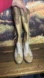 Elevate your look with these chic tan and brown heeled boots. Featuring fringe details and a comfortable heel, they add a stylish touch to any outfit. Used. Danced on the bar. Unbranded
