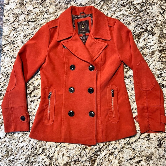Brighten your wardrobe with this striking orange pea coat. Features a classic double-breasted design.