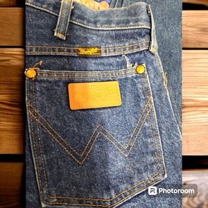 These blue denim jeans from Wrangler feature a classic five-pocket design with distinctive stitched patterns on the back pockets and a leather patch with the brand's logo. They're slightly faded, adding to their stylish look. The jeans are well-maintained with no visible tears, fraying, or stains. Duebto the age of the jeans the orinal size tag is worn, so please pay attention to the measurements. Perfect for casual wear. Feel free to make an offer!
