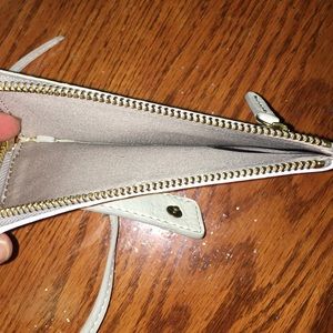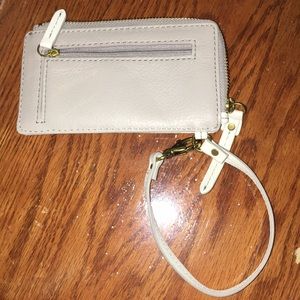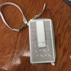 Boho slim card wallet for minimalist. Great addition to existing bags or on its own with matching leather wrist strap. White and misty gray, perfect for organizing your essentials with style.