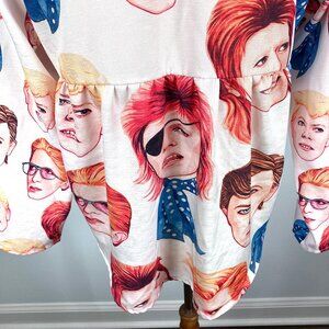 Express your unique style with this vibrant graphic print top. Featuring a bold design with David Bowie portraits, this top is perfect for making a statement. Ideal for casual outings or adding a pop of color to your wardrobe. Perfect for 80s and Bowie fans alike!