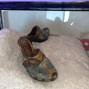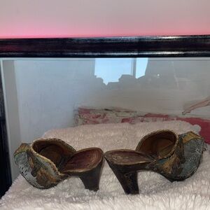 Vintage pair of rare clogs only owned by me bought in South Africa made in Italy lots going on here leather lace cutouts brass buckle real snakeskin leather on the tips and sides