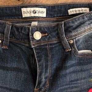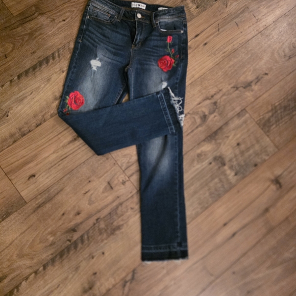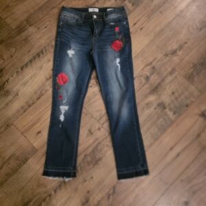 Elevate your wardrobe with these chic straight leg jeans featuring vibrant red floral accents. Perfect for a modern, stylish look.