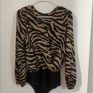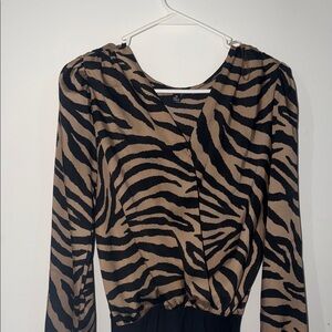 Trendy zebra patterned top with long sleeves. Features a striking black and tan design.