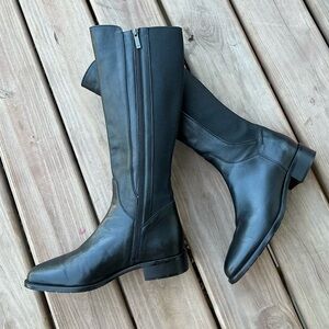 Chic style and all-weather practicality beautifully combine on this Italian-crafted tall boot made with Aquatalia's signature weatherproof finish. Elasticized inset panels create a custom fit so you stay comfy no matter what's in the forecast. Sizing: True to size. M=standard width - Almond toe - Leather with contrasting textile construction - Inner side zip closure - Padded footbed - Low block heel - Approx. 16" shaft height, 15-16" opening circumference - Approx. 1.25" heel .