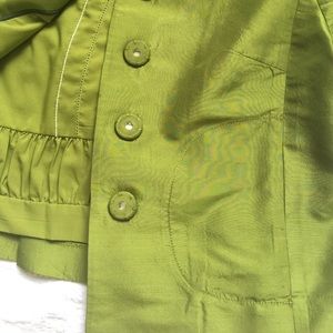 Very good condition. Very minor spot in the back from dry cleaners that I just noticed. Barely noticeable. Very cute plead detail in the back, buttons on the sleeves and snaps in the front. Has hidden pockets. Fully lined. I wore this to the office with black skirt and a cute tank top.