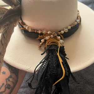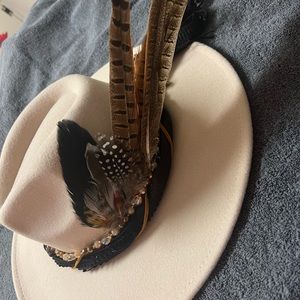 This stylish hat can be worn with just about any color. It can be dressy or casual. Cream hat. With black and brown band and multi different bird feathers.