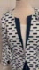 Elegant navy blue and white patterned suit with a chic design. Features a stylish jacket and matching skirt.