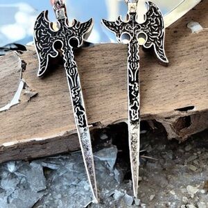 Stylish silver toned axe earrings with detailed design. Perfect for a bold statement. Dungeons and Dragons jewellery. DND jewellery. Barbarian battle axe earrings. 2” battle axe pendants. Gorgeous battle axe earrings for that Barbarian dungeons and dragons player. Great dungeons and dragons gift for your D&D player. Great gift for anybody who role-plays using a battle axe. Size see picture with US quarter.