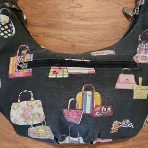 This chic handbag features a vibrant print on a black background, perfect for adding a pop of color to any outfit. Its unique design and sturdy construction make it a must-have accessory.Measure about 11" x 7". Embellished with beads and sequins. Good used condition