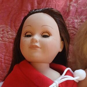 This charming doll set features three dolls dressed in vibrant outfits. The first doll wears a festive red dress, the second is in a chic beige dress, and the third sports a colorful yellow floral outfit. Perfect for imaginative play. K-3