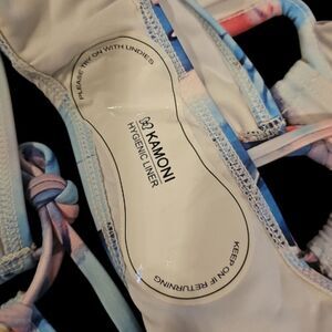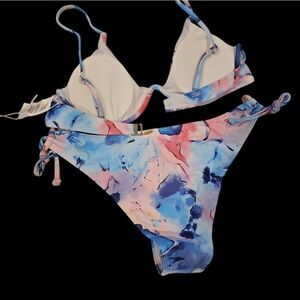 Vibrant bikini with abstract design. Features adjustable straps. Perfect for beach days. lightly padded