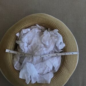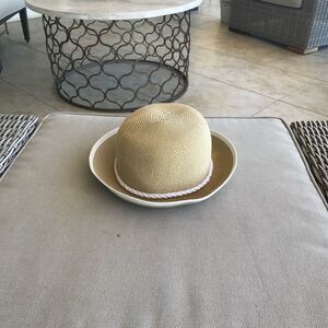 Chic tan hat with a classic design. Perfect for any occasion. White rope band with silver anchor charm