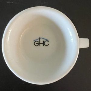 Sip your favorite drinks in personalized style in this elegant white pedestal mug / cup that features a Navy blue stylized flower within a large, capital letter E to represent the initial of your first or last name. Matching decorative Navy blue rings adorn the base and rim. Stylish and comfortable handle. From GHC.