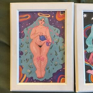 This collection features three framed illustrations showcasing elongated and voluminous figures in warm shades of peach and pink. Each piece is set against a contrasting background, with intricate patterns enhancing the overall elegance. Perfect for adding a touch of artistic flair to any space. The frames just have the picture, no glass!