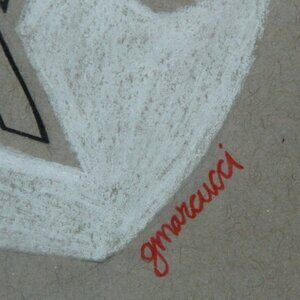 Framed drawing by artist G. Marcucci, possibly Giambattista Marcucci who is known for his artwork including pen and ink drawings and documentary productions. The drawing features a stylized woman's face with a butterfly in her hair and an earring in a tattoo-inspired aesthetic. The woman's hair is dark and curly, and her facial features are distinctively drawn with bold lines and shading. Signed "gmarcucci" in the lower right. Comes in a black frame for hanging or tabletop.